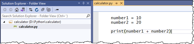 Below you see the simple Python-code inside my calculator.py as displayed in my development environment Visual Studio 2019 (or IDE - Integrated Development Environment, a fancy word for the code-editor and other tools bundled together into a program. You can of course use whatever you like, and I recommend taking a look at Visual Studio Code or PyCharm)