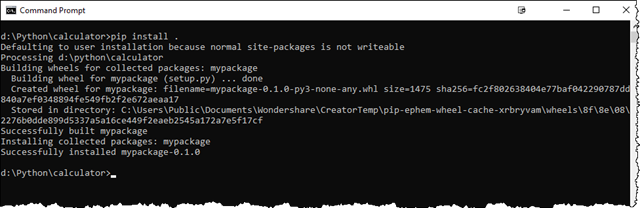 pip does it’s magic and amongst the output you see that your package with the importable name mypackage has been created as mypackage-0.1.0 (yes, the version number from your setup.py).