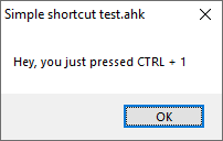 The “hat” + 1, defines that AutoHotKey should react when the CTRL-key is pressed together with the “1”-key. There are other ways to define other keys if needed. If you for example want to use CTRL + SHIFT + 1 instead, the code would look like this: ^+1::